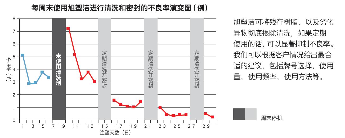 来自国内一家手机零部件制造商与一家塑料日用品生产商的实际案例显示,在使用了旭塑洁之后,不仅良品率提升、因清洗产生的停机时间大幅缩短,综合成本降幅较之前更是分别达到了61%和71%。