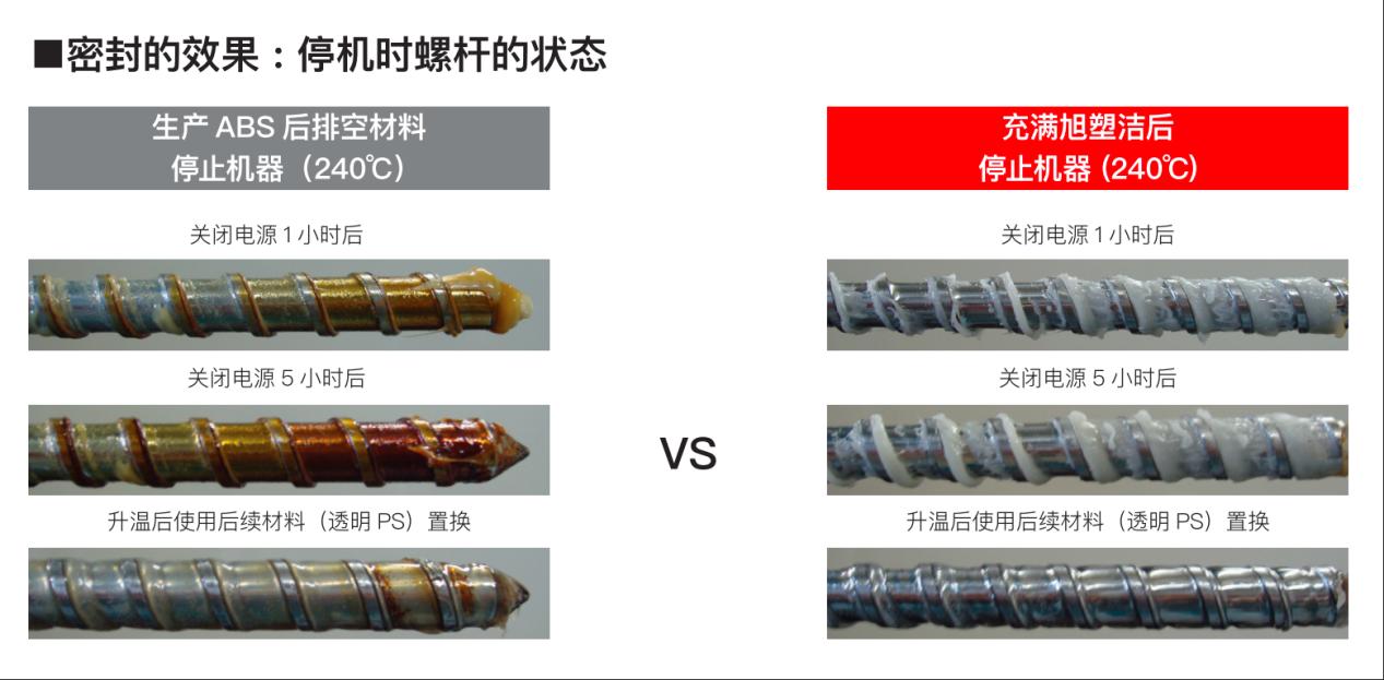 在预防性维护中,密封技术尤为关键。定期清洗,即在脏污尚能去除时清洗。而密封,则是持久保持设备的干净状态。原来,注塑机工作结束时,螺杆余热还在,残存的塑料很容易继续碳化,形成新的黑斑。旭塑洁的清洗剂颗粒此时进入,填满螺杆及腔体,像给机器套了个“保鲜膜”,隔绝空气,防止“隐形碳化”。